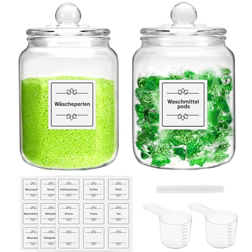 Lot de 2 bocaux verre pour buanderie, détergent, autocollant...