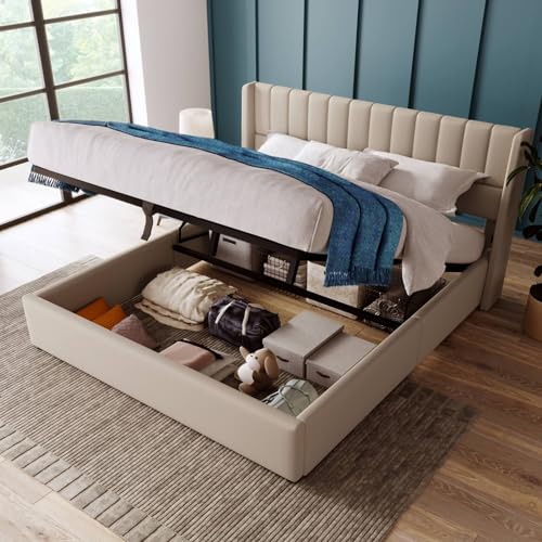 KOMHTOM Lit Double Rembourré Lit Coffre avec Rangement sous...