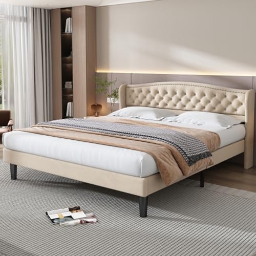 Zravenna Lit Capitonné Velours, Lit Simple/Double Beige, Des...