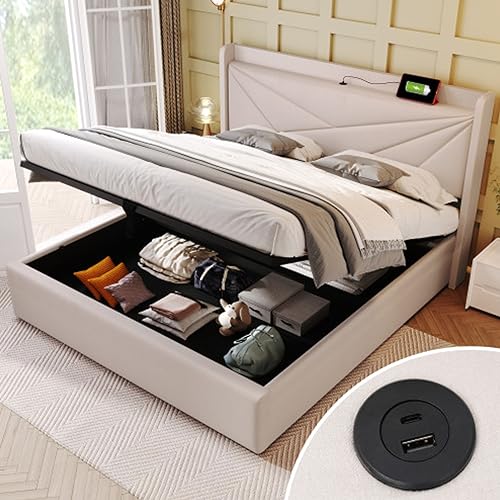 Lit rembourré King Size Rangement Double avec fonction USB T...