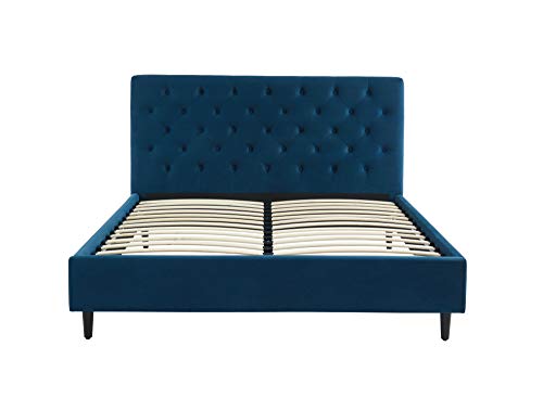 Lit adulte HUBERT 160x200cm, finition velours bleu paon