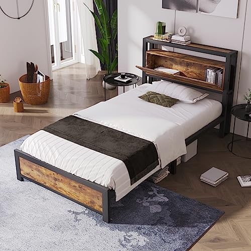 Lit métal simple 90 x 200 cm, tête de rangement et sommier,...