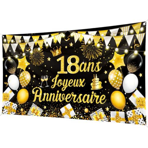 18 Ans Bannière Joyeux Anniversaire Noir Or 200 x 110cm 18 A...