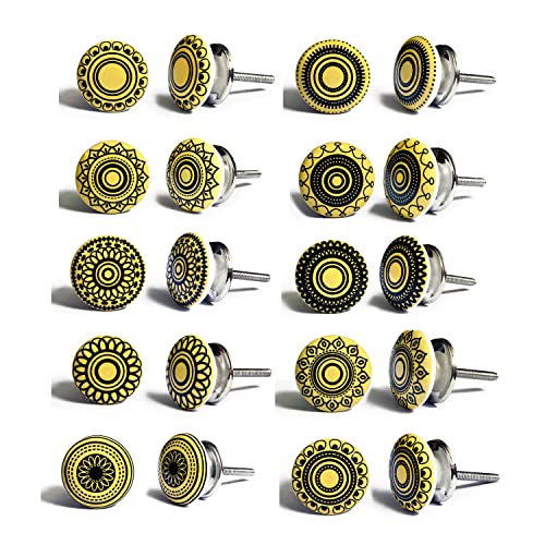 Jeu de 10 pomos céramiques jaune moutarde, formes variées, p...