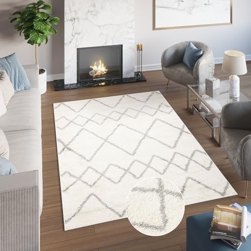 Tapis Shaggy Crème Gris Long Poil Épais Zigzags Moderne Supe...