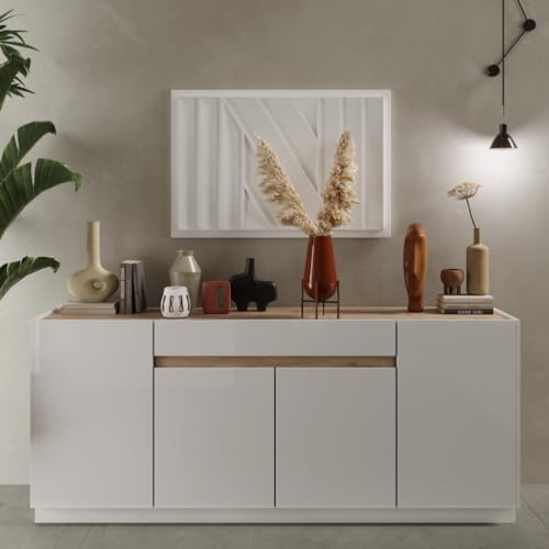 Tousmesmeubles Buffet 4 Portes 1 Tiroir Blanc Brillant/Chêne...