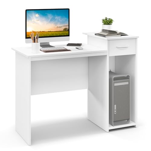 COSTWAY Bureau Blanc, Table d''Ordinateur avec Tiroir et 2 É...
