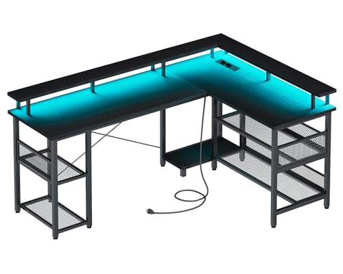 Bureau d'angle ODK avec rangement, LED réversible, 2 prises...