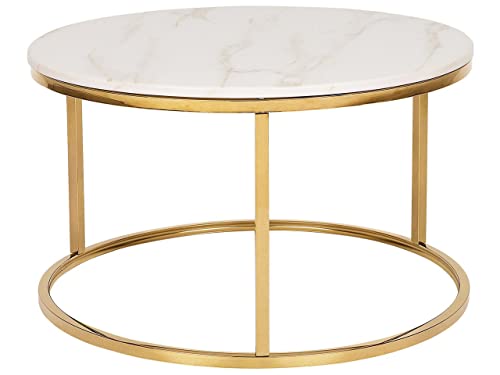 Basse Ronde Marbre Beige MDF Plateau Effet Cadre Métal Doré...