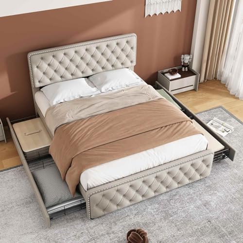 KOMH Lit Double Rangement Cadre Lin Beige 140X190CM