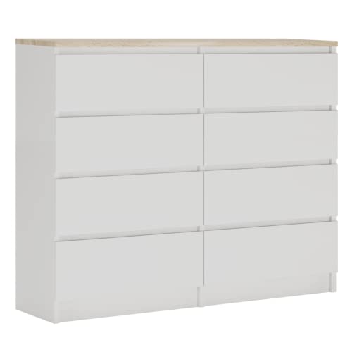 Living.com Commode 120cm, 8 tiroirs, Blanc/Chêne