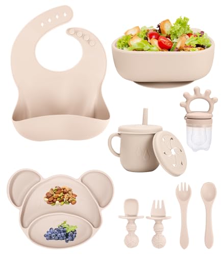 Assiette bébé silicone 10 pièces, ventouse, couvercle, gobel...