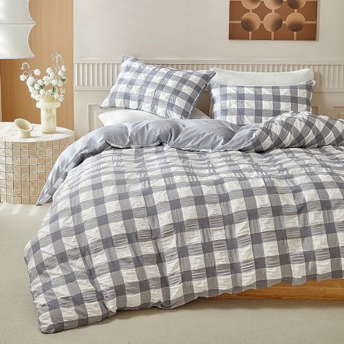 Freyamy Seersucker Parure de lit gris 220x240 carreaux ferme...