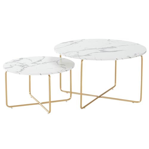 Link1Ga Lot de 2 tables basses rondes marbre blanc
