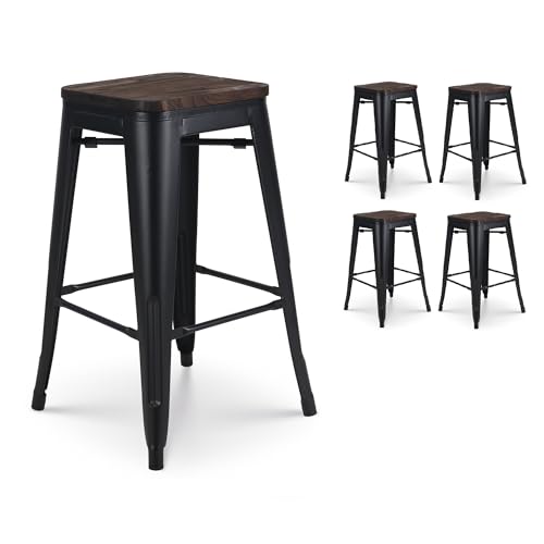 Kosmi - Lot de 4 tabourets métalliques noirs et bois foncé