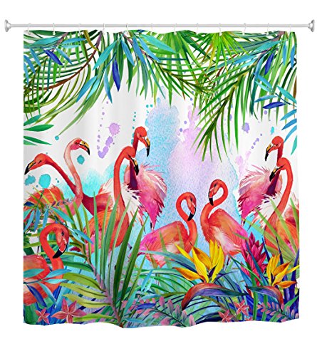 Long rideau de douche flamants roses avec feuilles tropicale...