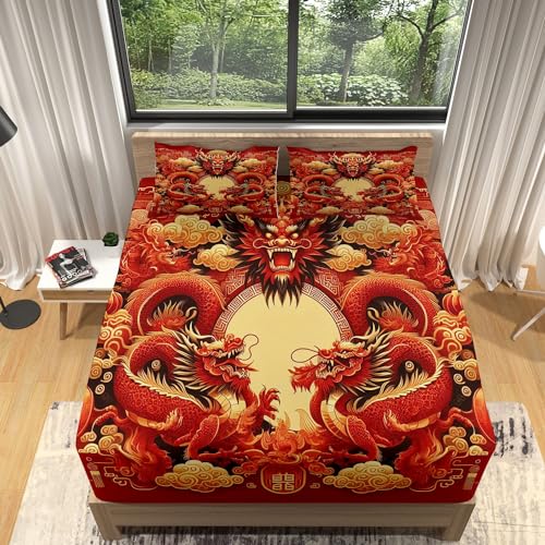 Drap Oriental Rouge Dragon 160x200 cm Anti-Plis Élastique