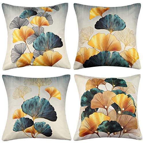 Coussins Imprimés Ginkgo Dorés 40x40 Lin Turquoise et Or