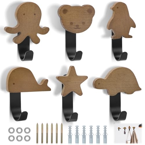 6 pièces porte-manteau pour enfant murales noyer, animaux-ou...