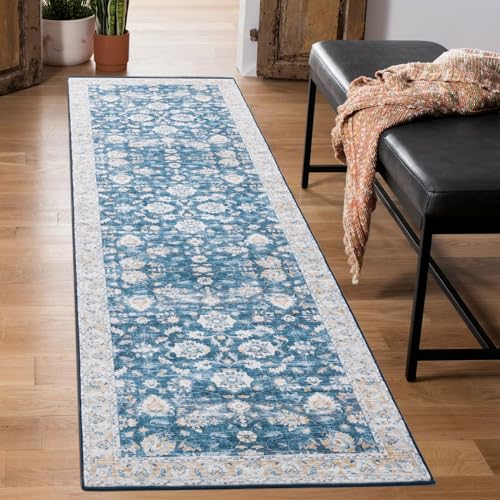 Tapis de coureur vintage floral vieilli 60x230cm bleu imperm...