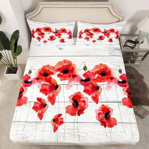 Aozhiswe Drap Housse 160x200 Fleur de Coquelicot Rouge Draps...