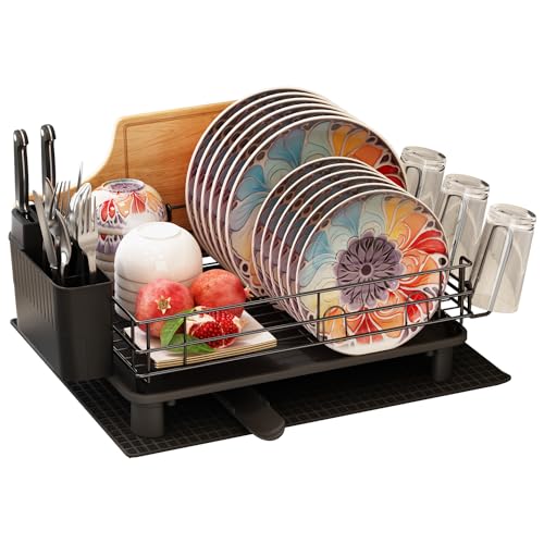 Vaisselle Égouttoir Noir INOX avec Porte-Gobelets et Porte-U...