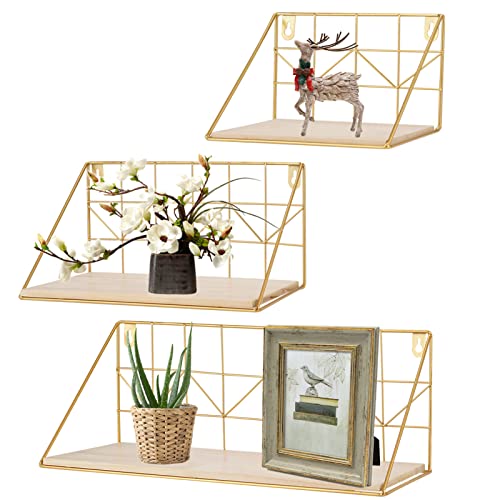 JoyB Lot de 3 étagères murales dorées métal & bois - étagère...