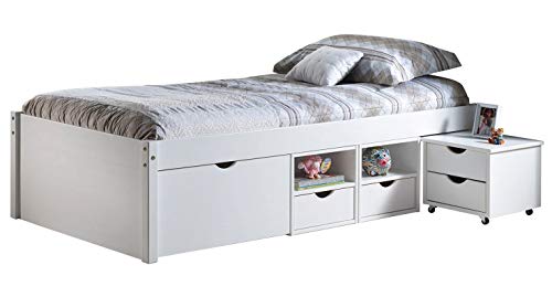 Lit avec plusieurs bacs, tiroirs, tables de chevet, étagères...