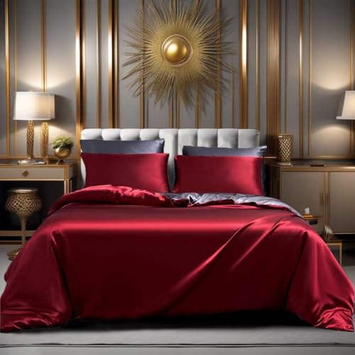 Gezu Housse de Couette Satin 220x240cm Rouge Gris Foncé Doub...