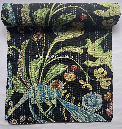 Sambhav Kantha Queen King Size Cover avec Housse Noir Califo...