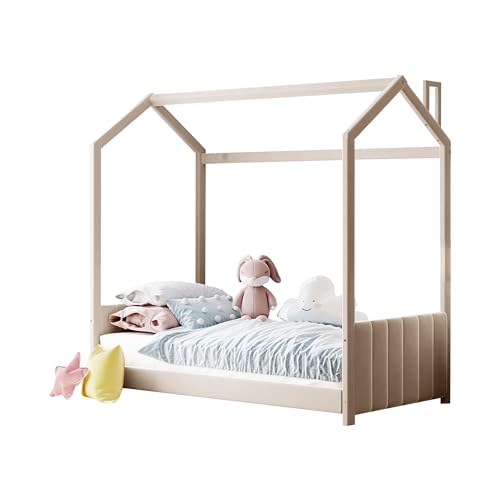 Azkoeesy Lit Maison Rembourré Velours Doux 90x200cm Beige