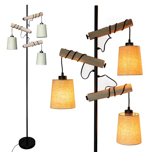Lampadaire de salon vintage : lampadaire en bois avec 3 abat...