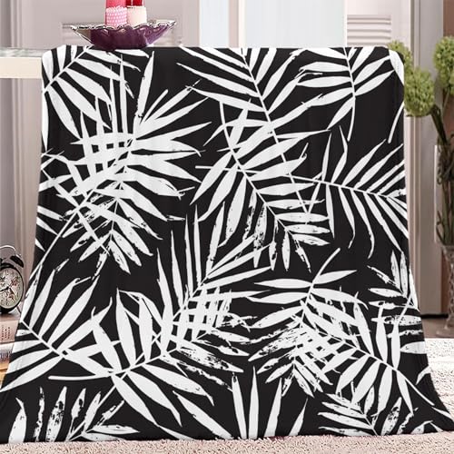 Quixora Plaid Couverture Polaire Blanc Feuilles Noir Impress...