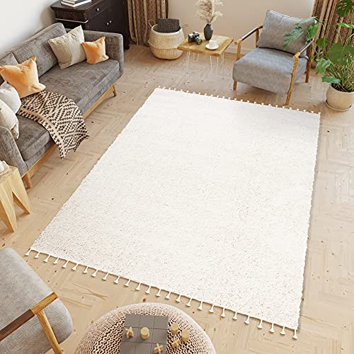 Tapis Boho Shaggy Long Poil Crème Uni Franges Salon Ado Enfa...