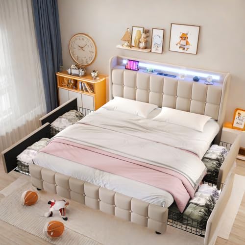 KOMHTOM Lit Double Rembourré avec Rangement sous Lit, Lit Pl...