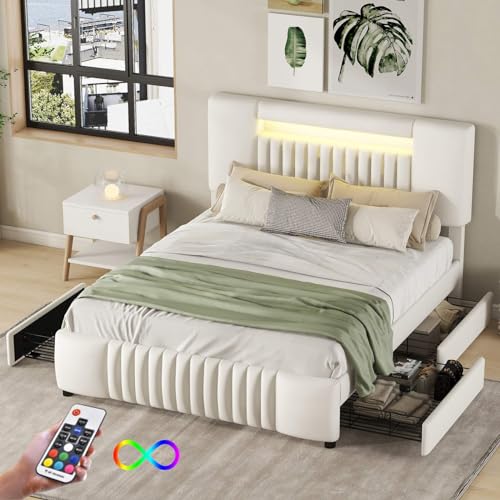 KOMHTOM Lit Rembourré Lit LED avec Tête de Lit, Lit Platefor...