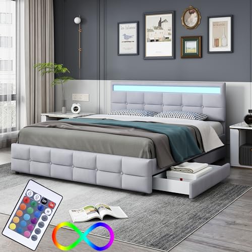 Lit rembourré 140x200 cm LED, sommier à lattes, rangement su...