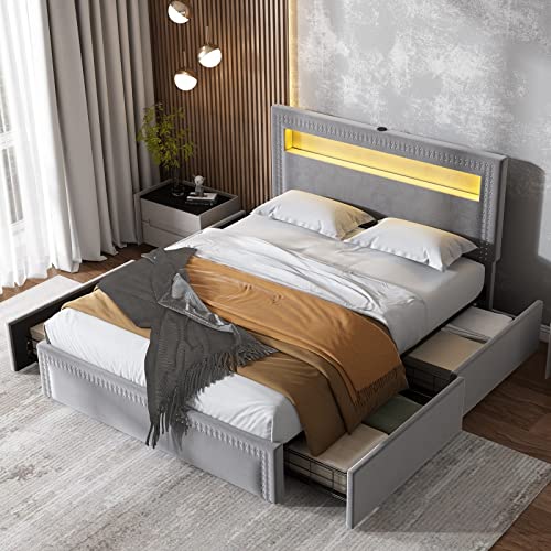 AMDXD Home Cadre de lit gris avec éclairage LED et 4 tiroirs...
