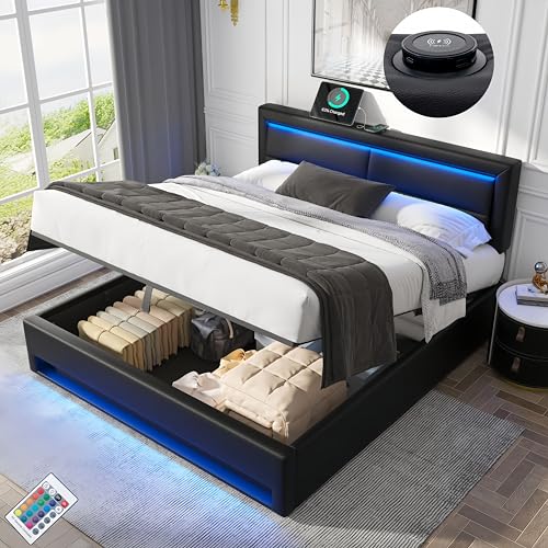 Lit 160x200 espace rangement LED sommier lattsr coffre port...