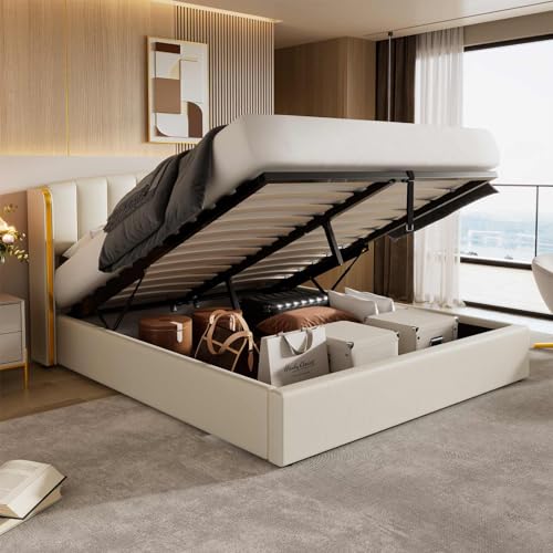 KOMHTOM Lit Double Rembourré Hydraulique Rangement sous Le L...