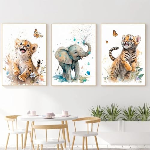 Poster animaux Safari Lion Éléphant Tigre Aquarelle Mural Ju...