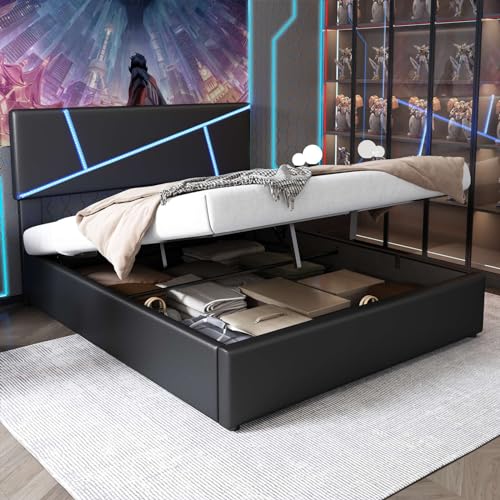 KOMHTOM Lit Coffre Lit LED Rembourré Hydraulique avec Tête d...