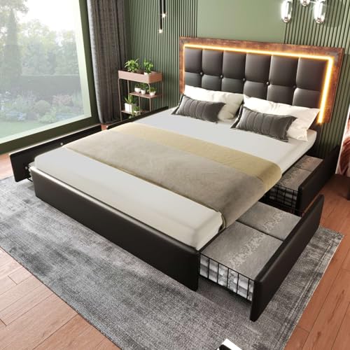 KOMHTOM Lit Rembourré avec 4 Tiroirs de Rangement, Lit LED a...