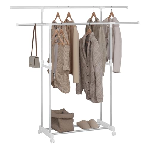Porte-vêtements double tringle extensible, roulettes, pender...