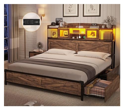 Cadre Lit Queen Size Rangement LED, Plateforme Marron Lumièr...
