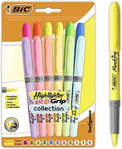 6 surligneurs BIC Highlighter Grip intenses et 6 pastel au g...
