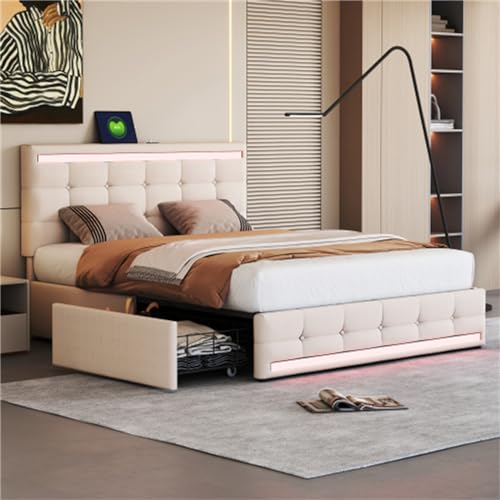 Cadre De Lit LED Rembourré – Luxueux avec 4 Tiroirs De Range...