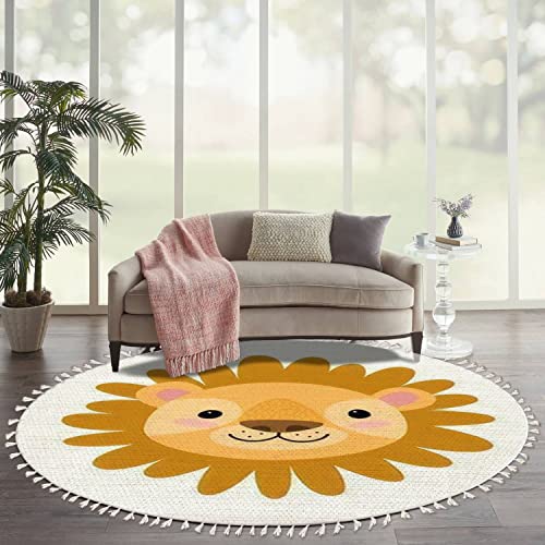 Tapis rond bohème en lin et coton - Motif visage de lion mig...