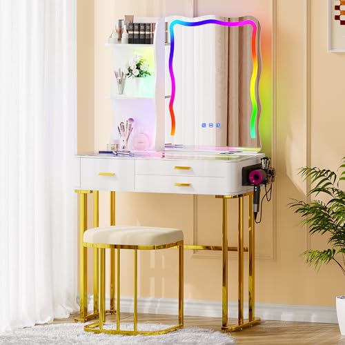 Coiffeuse miroir LED avec étagères et tiroirs Organiseur de...