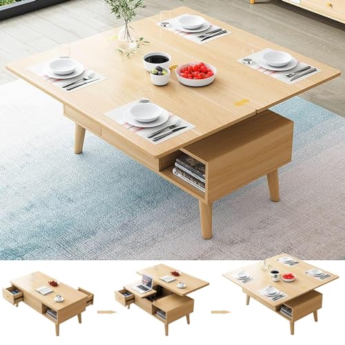 Table basse multifonction bois, plateau relevable, compartim...